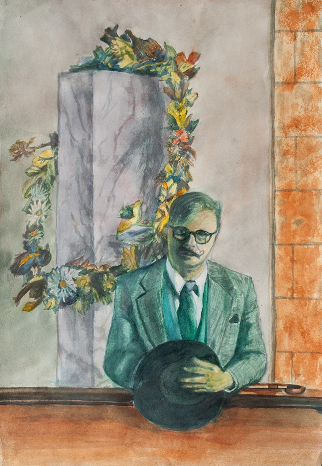 Portrait of my Acrylic teacher, Tom Steigerwald posing before one of his Floral Paintings
